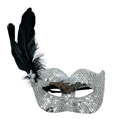Brilla con estilo en cualquier evento con este antifaz cubierto de lentejuelas y adornado con una pluma elegante que le da un toque sofisticado y festivo. Ideal para fiestas temáticas, carnavales y Halloween.