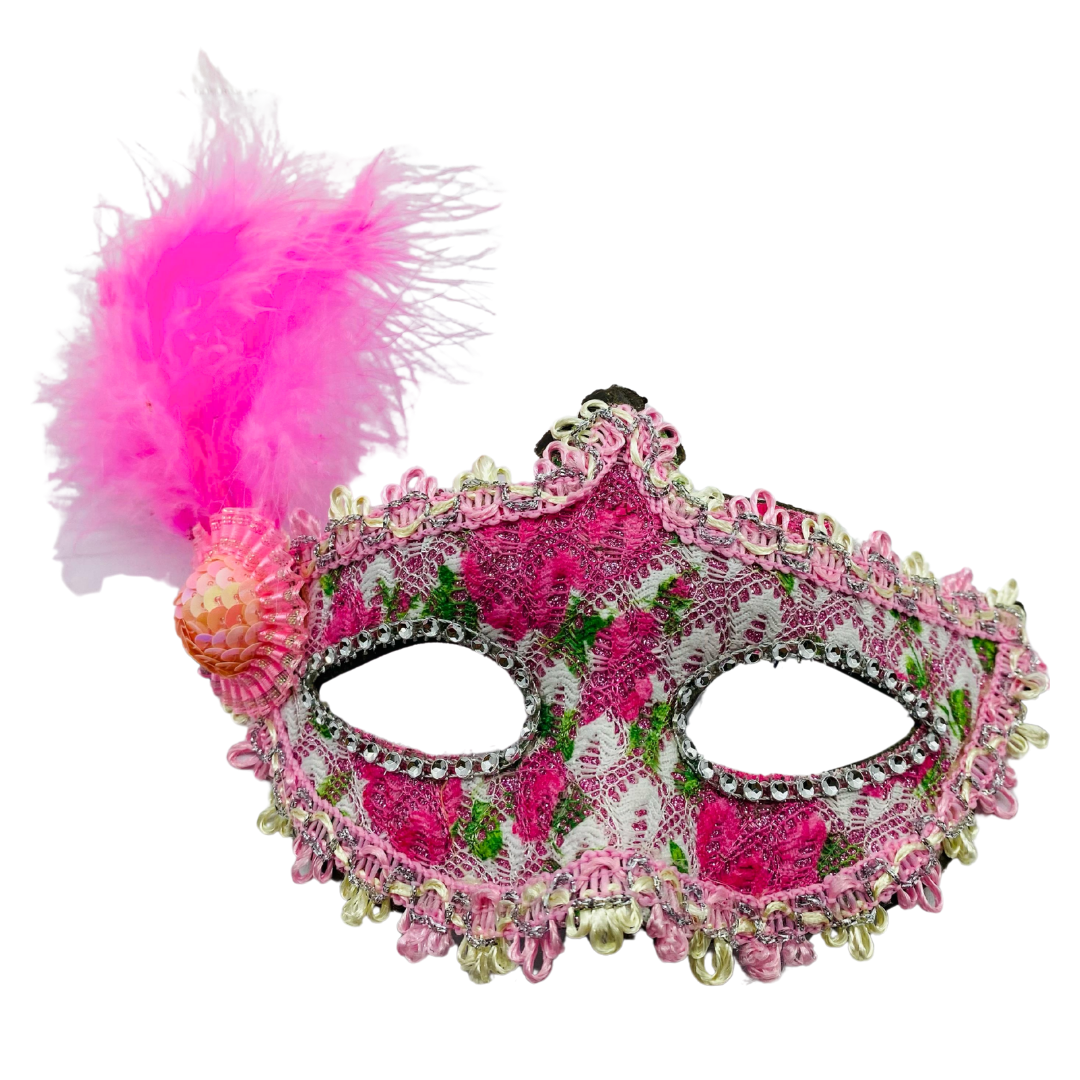 Inspírate en el glamour del carnaval de Venecia con este antifaz elegante y colorido. Decorado con una pluma larga en el lateral, es el complemento ideal para darle un toque de misterio y sofisticación a tu look.