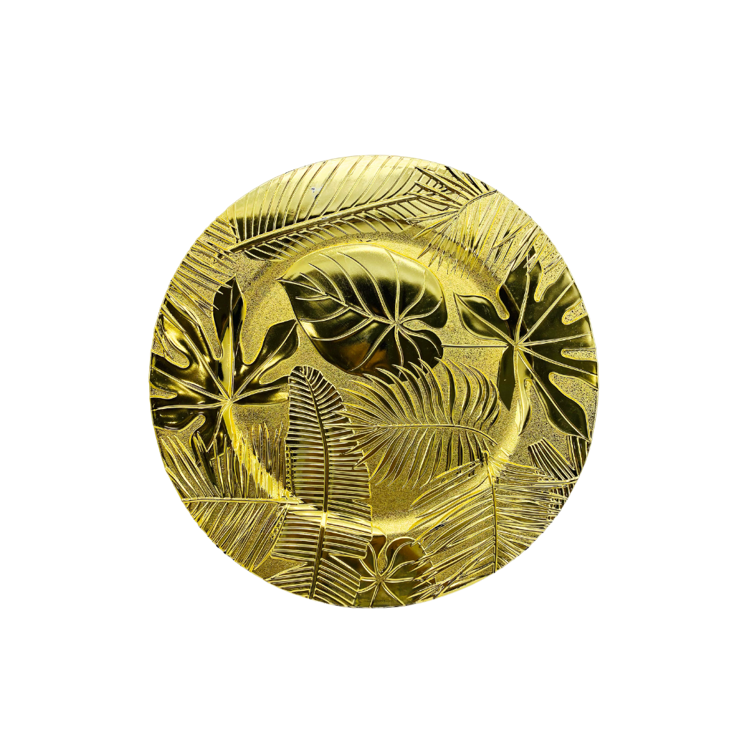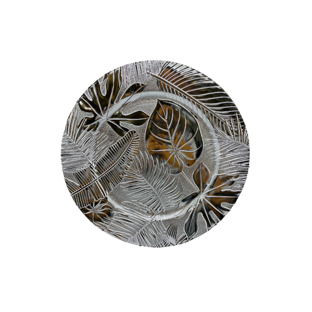 Bandeja decorativa con diseño de hojas doradas y diseño de hojas plateadas, perfecta para presentar alimentos, postres o bebidas con un toque elegante y sofisticado en tus celebraciones.