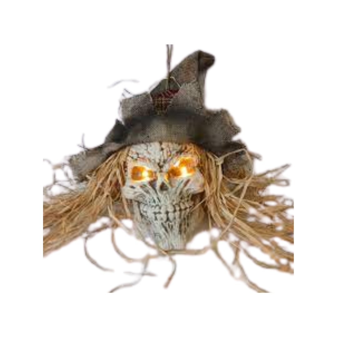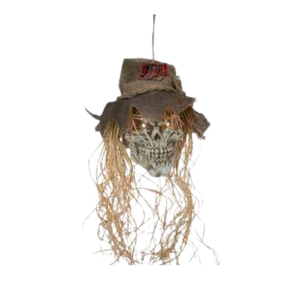 Terror desde las alturas. Este espantapájaros colgante de 70 cm cobra vida con luz y sonido integrados, activados por un mecanismo que añade realismo espeluznante. Perfecto para colgar en entradas, pasillos o decoraciones de Halloween que sorprendan a cualquiera.