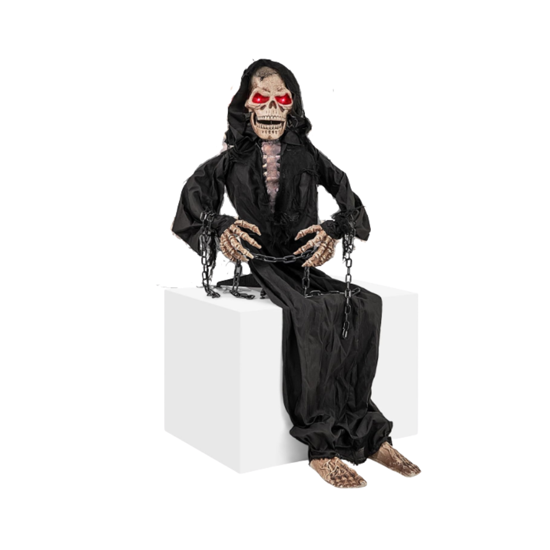 ¡Terror en tamaño real! Este impresionante esqueleto animatrónico mide 1.80 m y está equipado con luz, sonido, movimiento y sensor de proximidad para activarse al detectar presencia. Incluye cadena decorativa y base armable con 1 tubo central, 4 patas y conector de unión. Ideal para Halloween, casas del horror o exhibiciones espeluznantes.