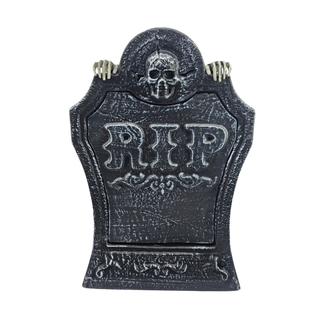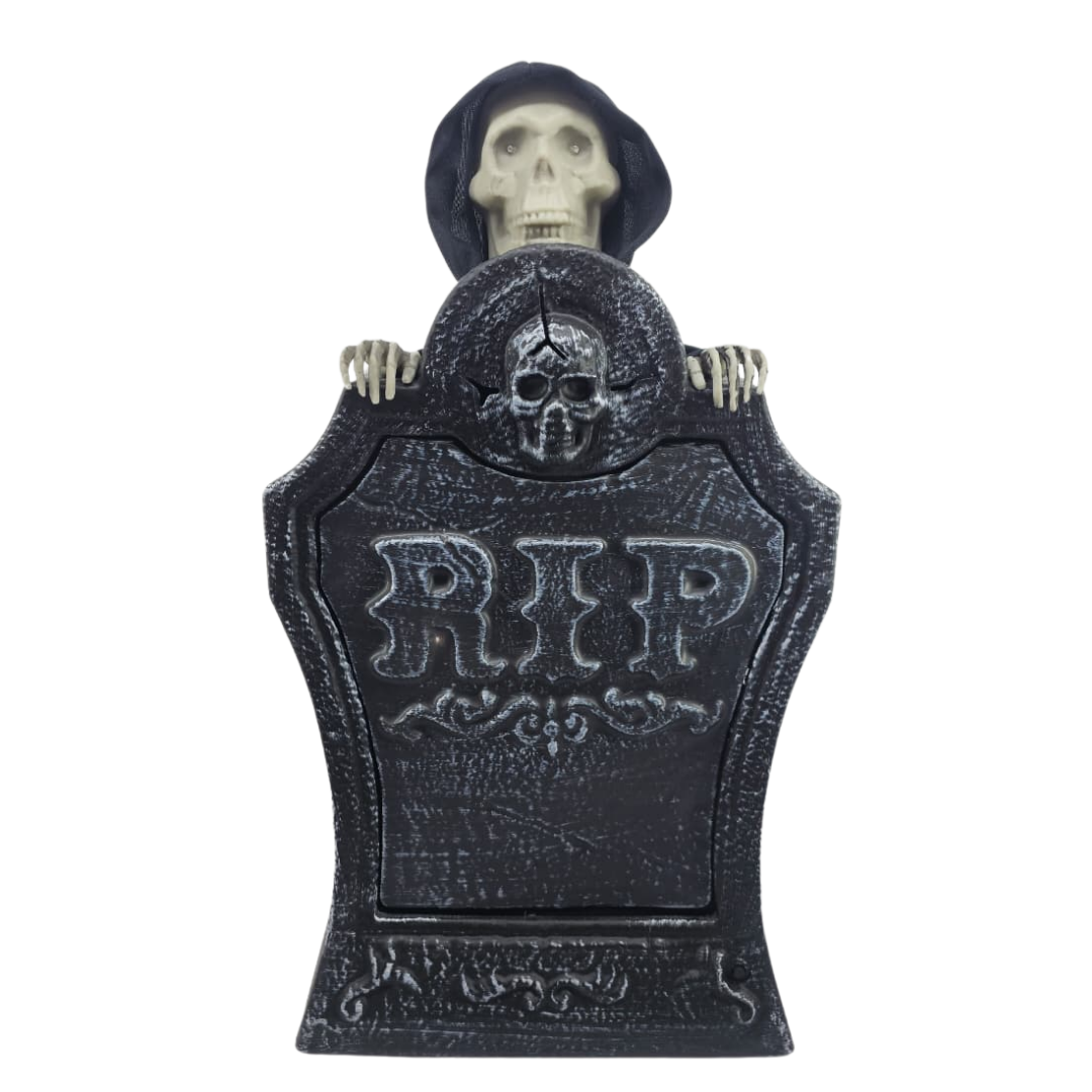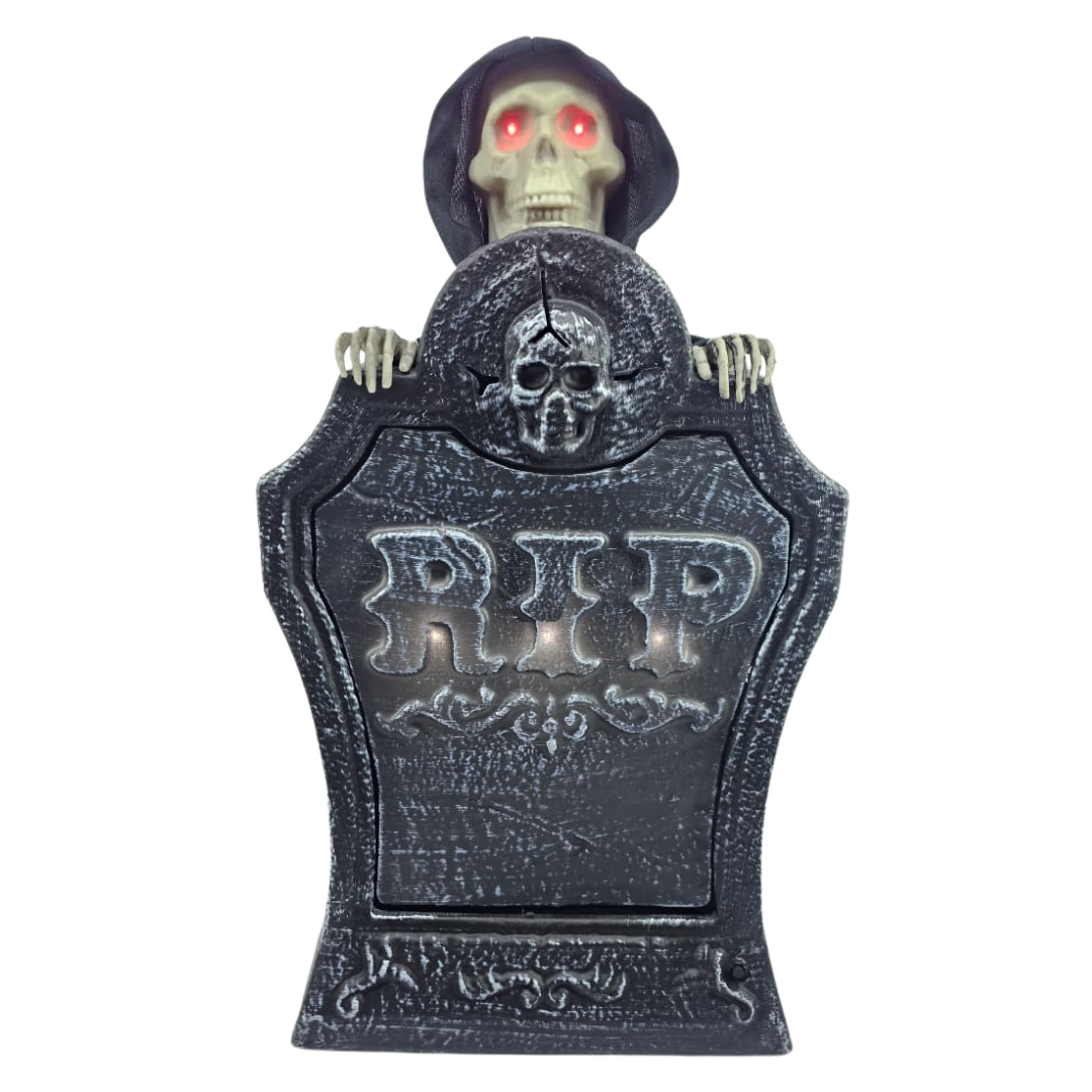 Lápida decorativa con calavera que se asoma por detrás, sube y baja mientras sus ojos se iluminan con luces rojas. Un efecto inquietante perfecto para decoraciones de Halloween que buscan sorprender.