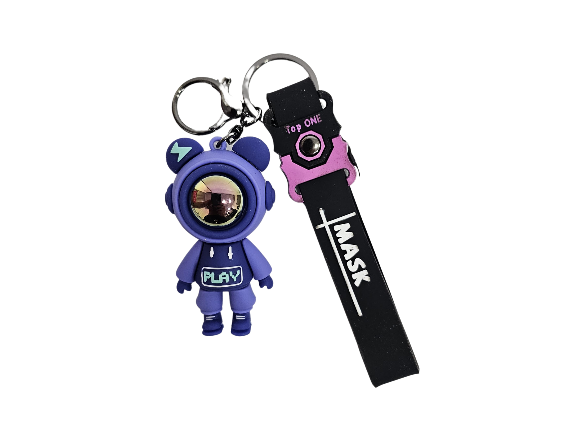 Llavero de astronauta con cabeza brillante. La tira del llavero dice Mask