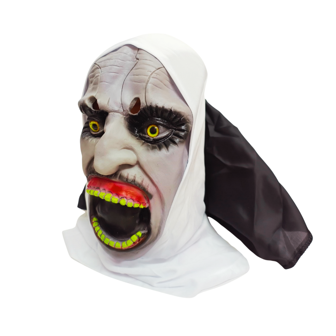 Máscara de látex de la monja, con detalles realistas y acabado aterrador. Ideal para disfraces de terror, Halloween y eventos temáticos. Flexible, cómoda y fácil de usar.