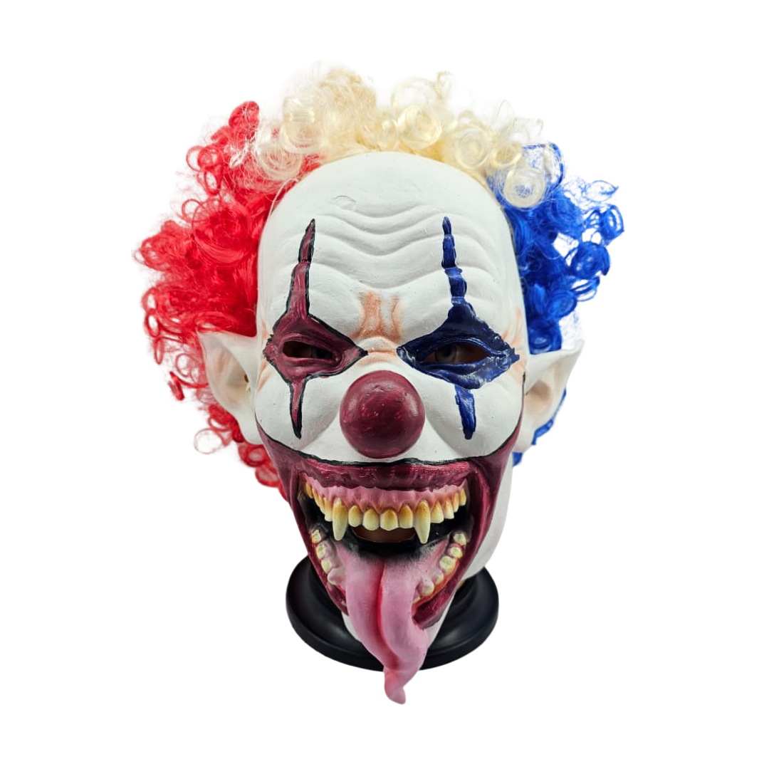 Máscara de látex payaso afro con cabellera rizada y lengua afuera. Diseño divertido y terrorífico, ideal para Halloween, fiestas temáticas y disfraces impactantes. Flexible, cómoda y llamativa.