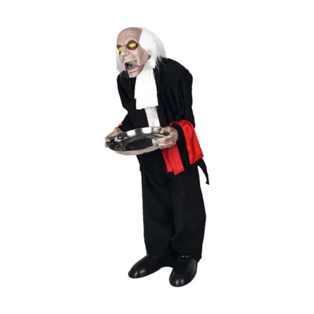 Elegante y espeluznante, este mayordomo sostiene una bandeja para dulces y cobra vida con su mecanismo animado.