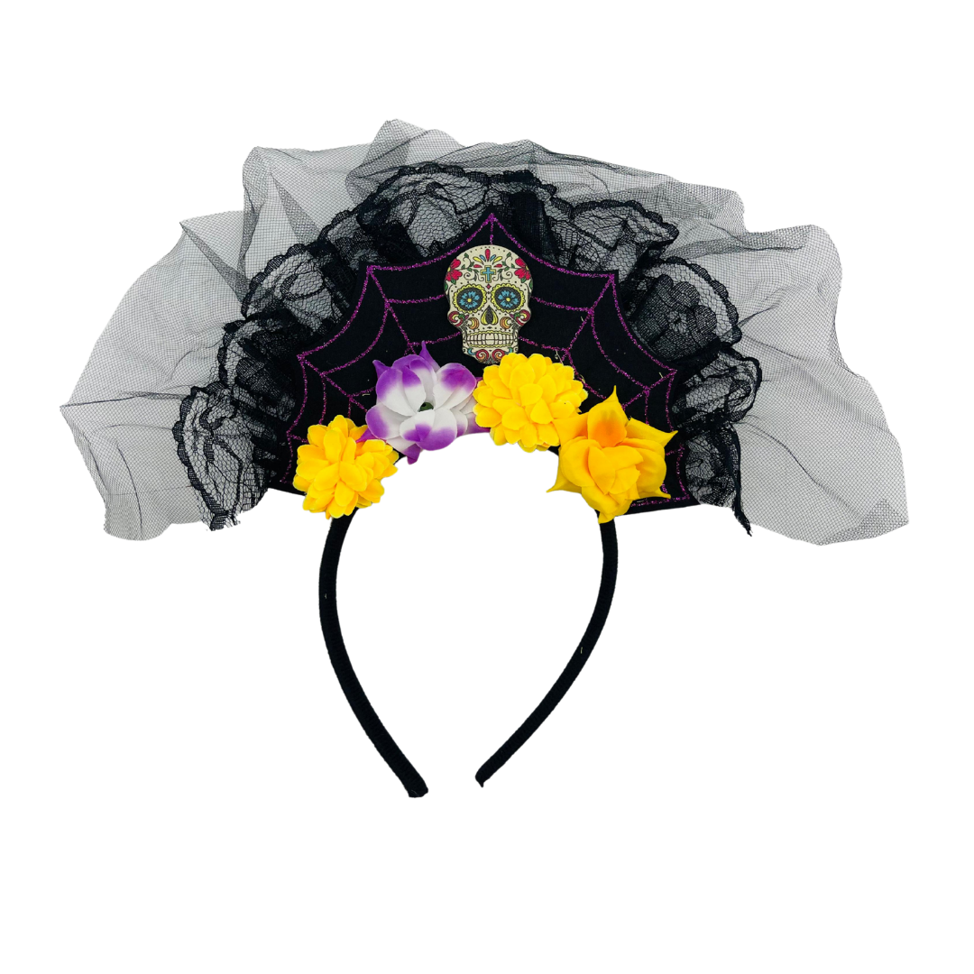 Tiara con flores vibrantes y delicado velo, ideal para crear el clásico look de Catrina. Perfecta para disfraces y sesiones fotográficas.