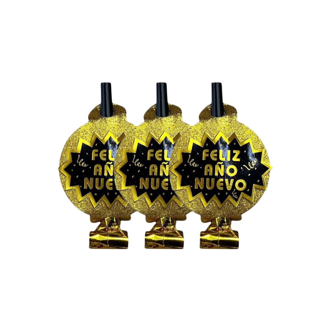 Set de 6 pitos festivos, perfectos para celebrar la llegada del Año Nuevo con diversión y mucho ruido.