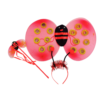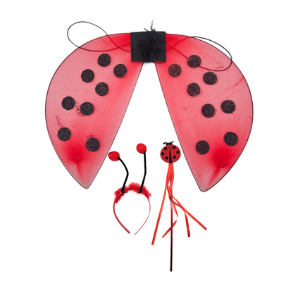 ¡Dale vida a tu disfraz con este encantador set de mariquita! Incluye alas rojas, tiara con antenitas y cetro. Disponible en dos adorables diseños:
