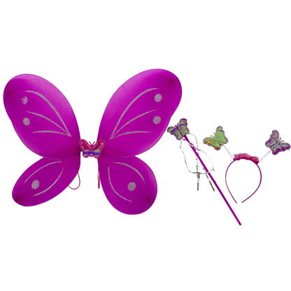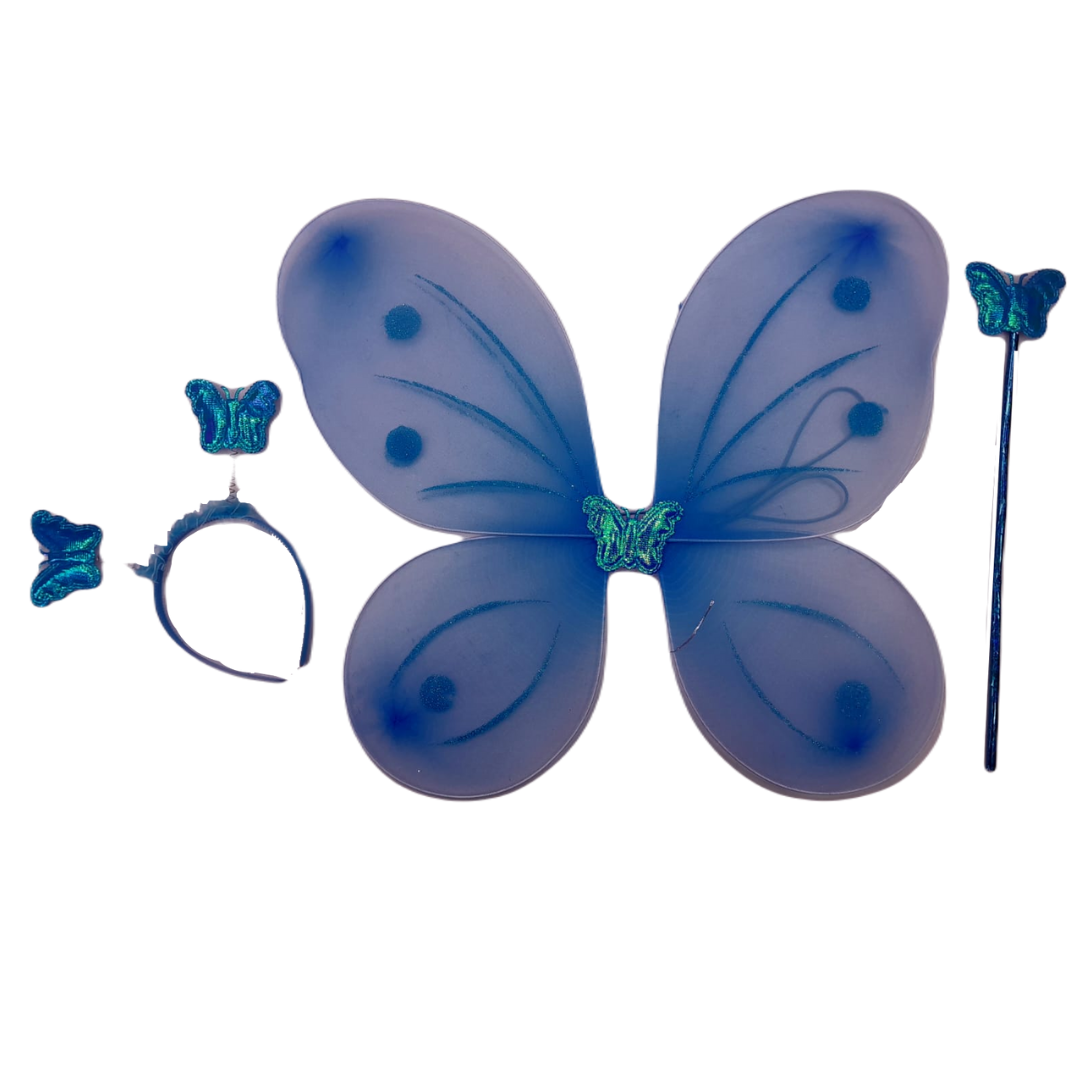 ¡Magia y color en un solo set! Incluye alas de mariposa en tonos azules y fucsias, tiara brillante y cetro encantado. Ideal para disfraces, juegos, presentaciones o fiestas temáticas. ¡Conviértete en una mariposa de fantasía al instante!