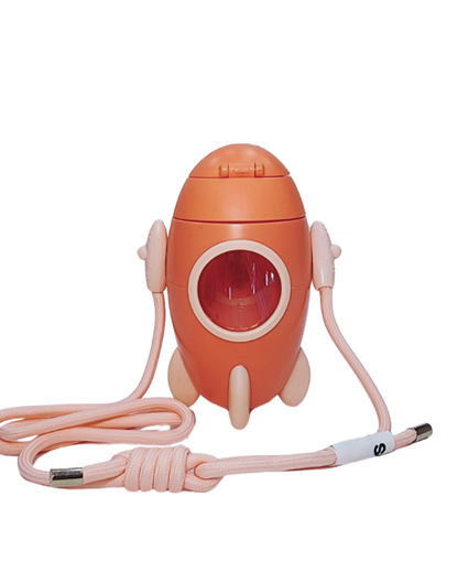 Termo plástico en forma de cohete, incluye pitillo y cordón para llevar.